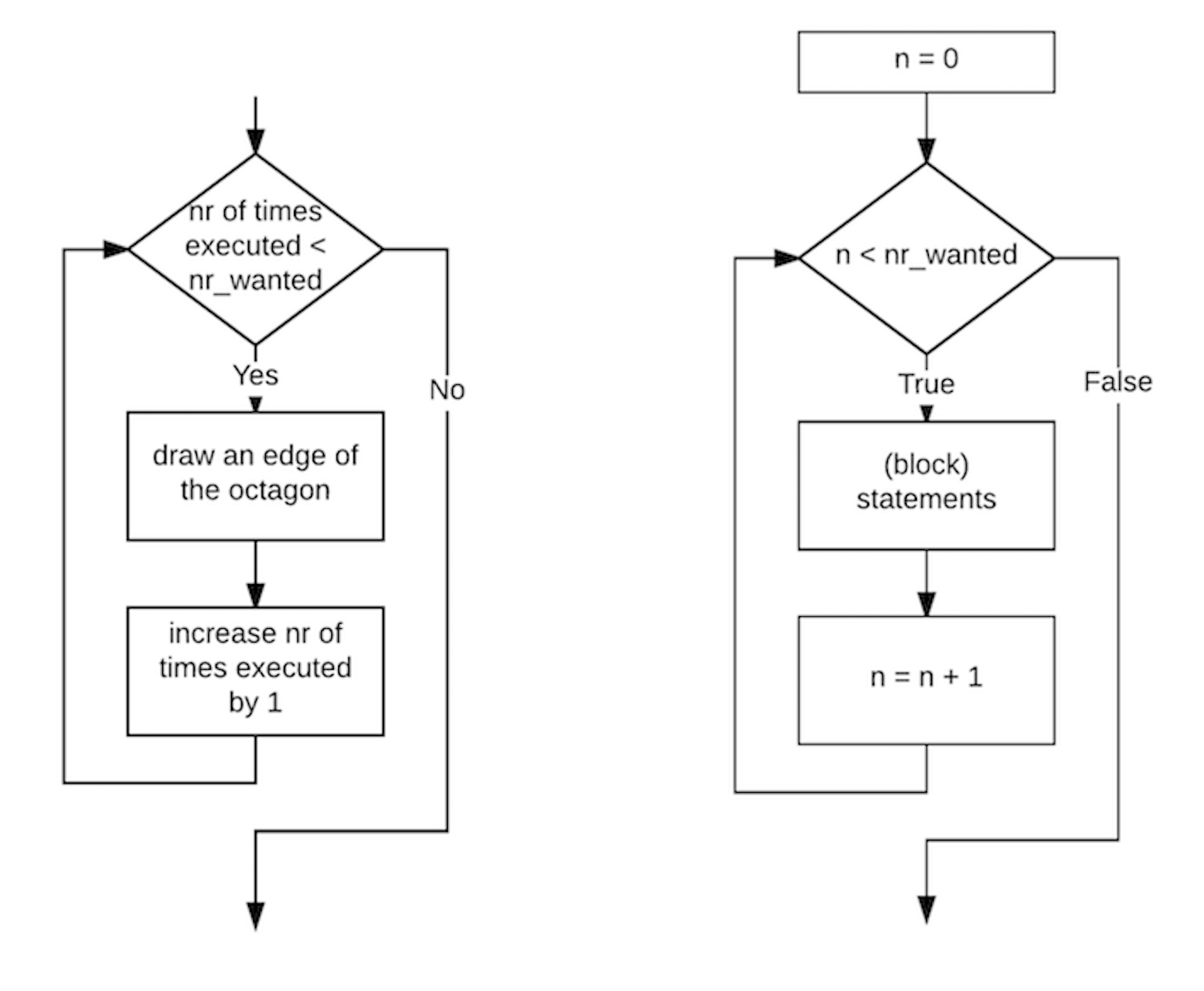 Fig. 5.2. Flowchart of the turtle while example. Left: The concrete case of the turtle drawing an octagon. Right: Translation of the general counting loop to (Python) variables and a condition.¶